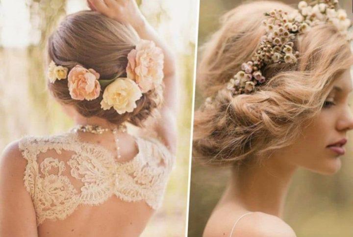 Для зимней свадьбы подходят необыкновенные рождественские веночки для волос из еловых и омеловых ветвей. Важным при этом остается аккуратное прикрепление к волосам этих живых аксессуаров, потому что они достаточно нежные и хрупкие. Самым главным в процессе выбора украшений для свадебной прически является понимание того, как их можно прикрепить к волосам. Не рекомендуется останавливать свой выбор на крупных зажимах, в особенности на заколках-автоматах, ведь лучшими будут декоративные цветы на прически на короткие волосы. Фото, свадебные прически, на которых имеются цветы, привлекают внимание множества женщин.