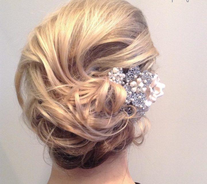 Это могут быть уложенные на одну сторону косы или завитые локоны, либо же аккуратный или нарочито небрежный пучок, из которого будут выбиваться пряди, красиво обрамляющие личико невесты. Также это могут быть уложенные на бок волнистые волосы в стиле 40-х.