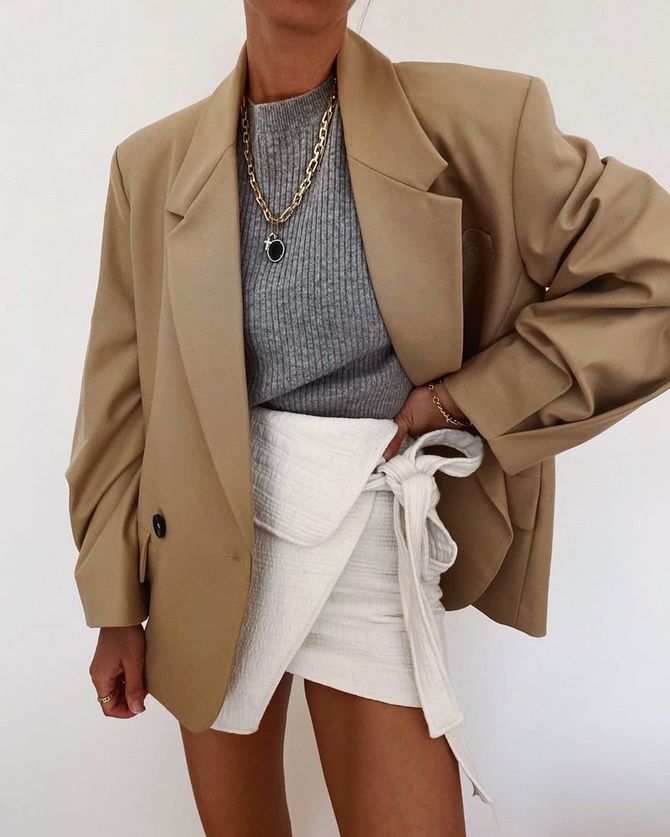 Бежевый пиджак надевают с короткими платьями и грубыми ботинками. Мужской крой и размер оверсайз часто компенсируют женственными топами и обтягивающими брюками. Получается стильно и очень сексуально.