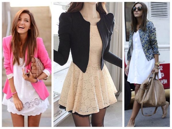 Самый женский предмет гардероба отлично сочетается с верхом различных моделей. Однако универсальным выбором будет приталенный пиджачок, который органичен в тандеме с платьем любого фасона. Этот ансамбль подойдет для: