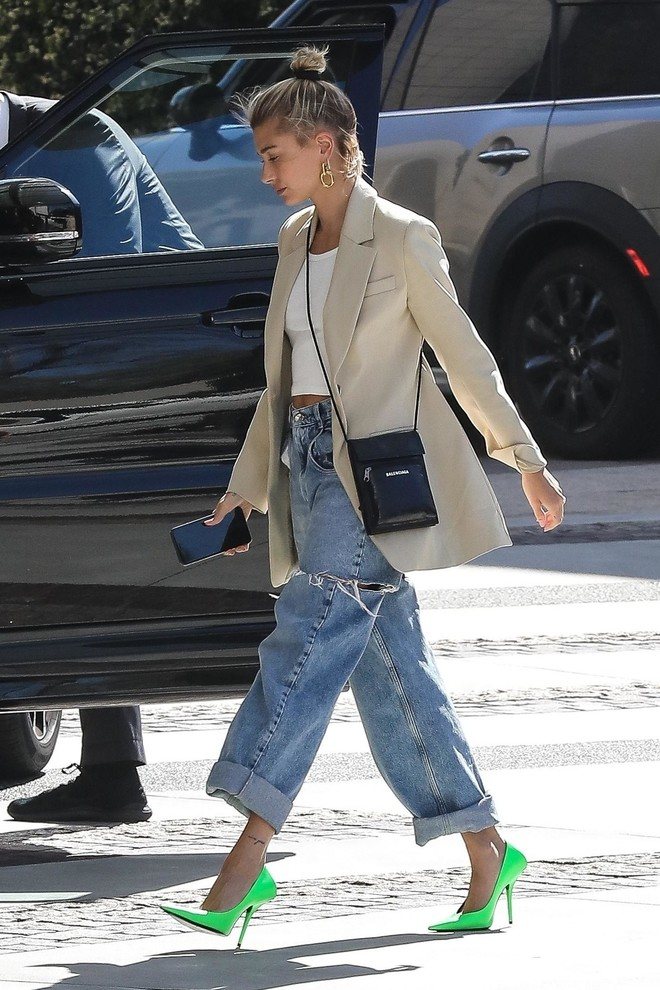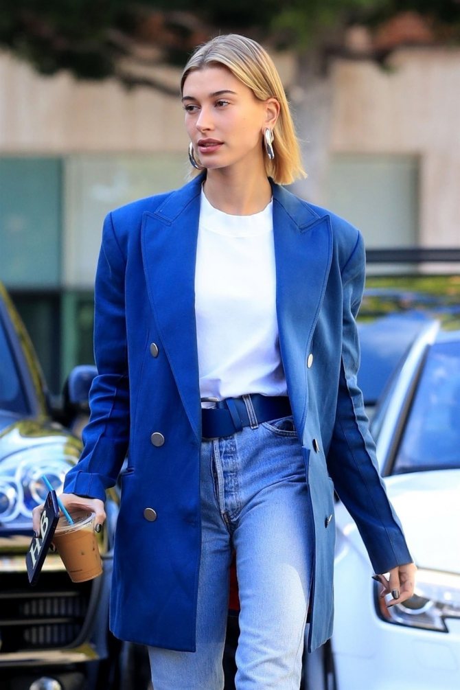Молочная модель в современном женском гардеробе по праву считается базовой, поскольку на ее основе можно создать много интересных луков, ничем не уступающим таким ярким образам, как синие брюки и красный пиджак для женщины. Только заменив резковатый алый цвет молочным, получите утонченный. Но не менее броский ансамбль. Возьмите пример с Хейли Бибер, оверсайз-блейзер бежевого цвета дополнив белым кроп-топом, нарочито широкими джинсами. В таком наряде вы точно будете смотреться эффектно!